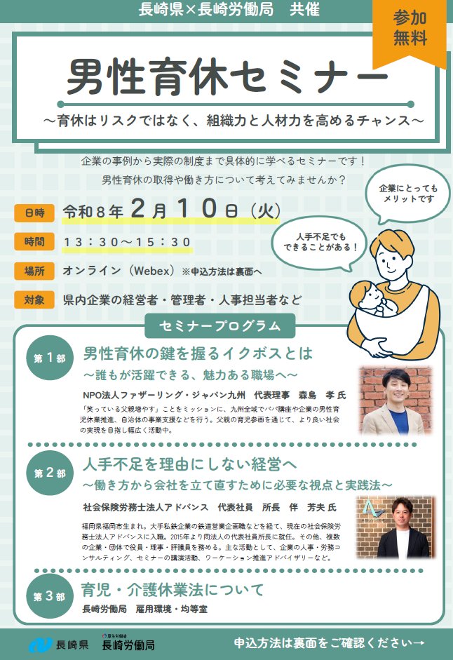 「NPO法人ファザーリング・ジャパン九州代表 森島孝氏」に加え、働き方改革で高い評価を受ける「社会保険労務士法人アドバンス所長 伴芳夫氏(※)」が、企業メリットや実践事例を紹介。さらに、長崎労働局が「育児・介護休業法」について詳しく解説します。男性育休を進めたい企業の皆様、ぜひご参加ください!